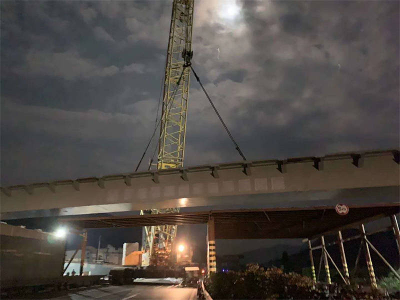 雅西跨線橋混凝土預(yù)制箱梁共計4片,本次架設(shè)的箱梁重140噸、長55余米,體積大、自身重、運(yùn)輸困難,且投入的大型機(jī)械設(shè)備較多,施工組織難度大。為順利完成架設(shè)任務(wù),市交通局多次組織召開專題會議,提前謀劃、細(xì)致安排、優(yōu)化組織,制定了施工專項(xiàng)方案和應(yīng)急措施。