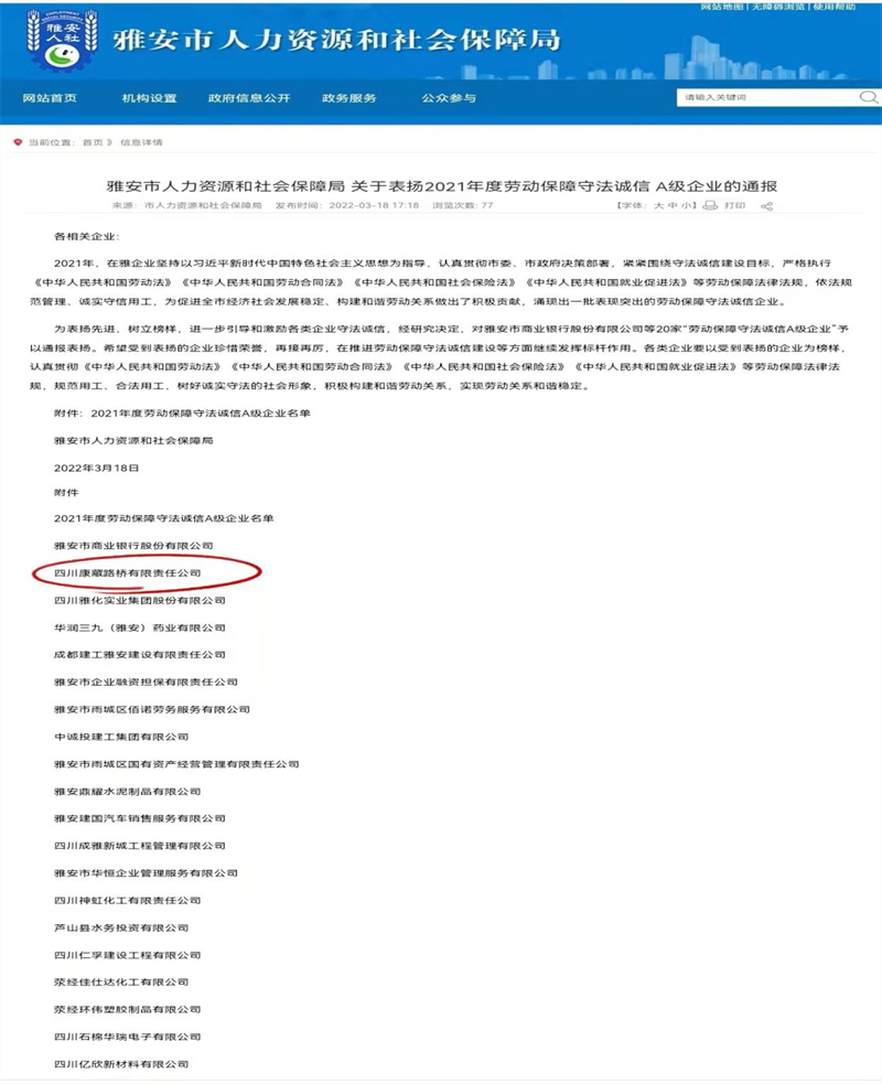 近日,根據(jù)《雅安市人力資源和社會(huì)保障局關(guān)于表?yè)P(yáng)2021年度勞動(dòng)保障守法誠(chéng)信 A級(jí)企業(yè)的通報(bào)》,雅安交通建設(shè)(集團(tuán))有限責(zé)任公司下屬四川康藏路橋有限責(zé)任公司榮獲2021年度勞動(dòng)保障守法誠(chéng)信 A級(jí)企業(yè),名列我市“誠(chéng)信紅榜”。