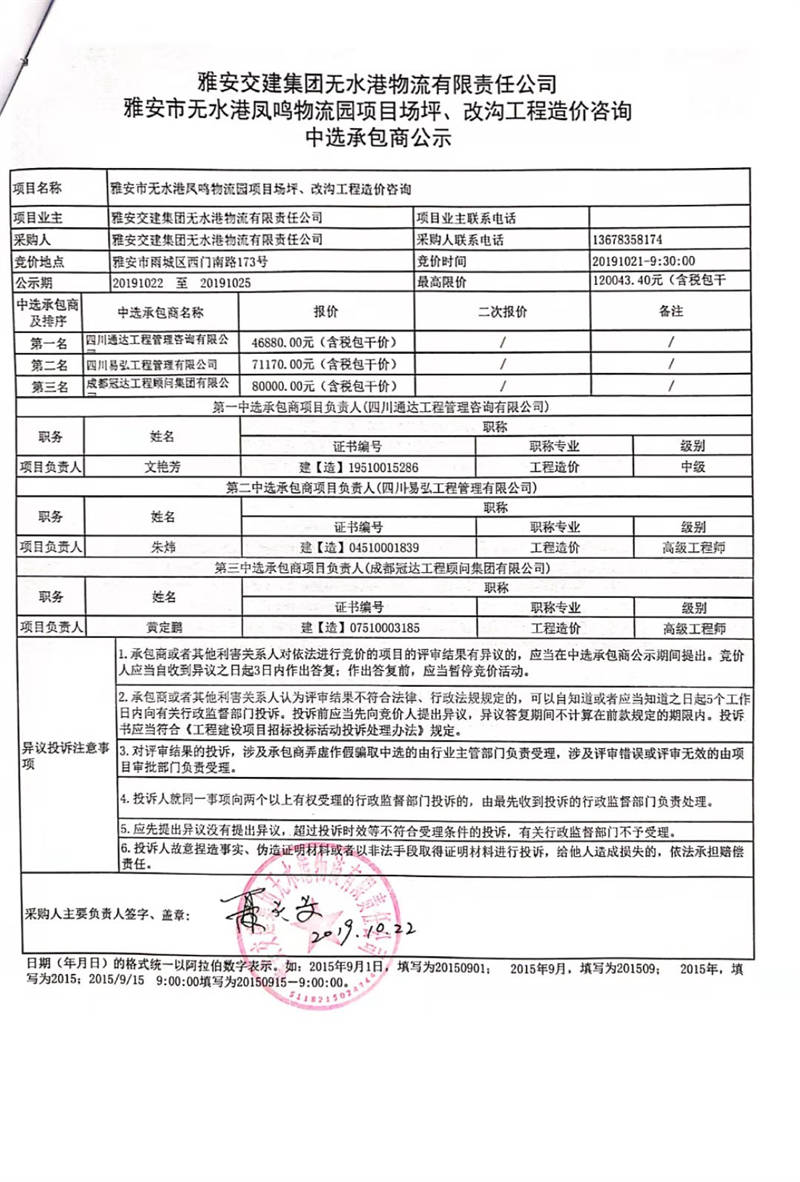 雅安交建集團無水港物流有限責(zé)任公司雅安市無水港鳳鳴物流園項目場坪、改溝工程造價咨詢中選承包商公示