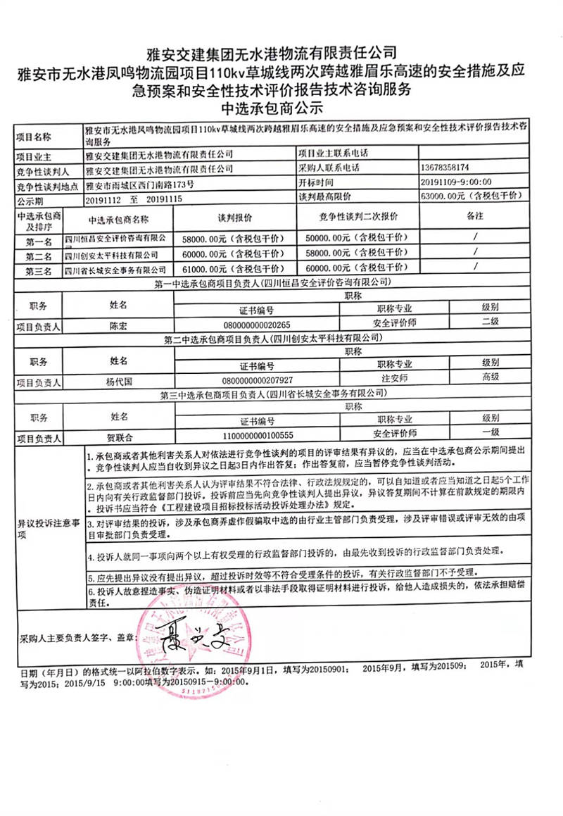 雅安交建集團(tuán)無水港物流有限責(zé)任公司雅安市無水港鳳鳴物流園項(xiàng)目110kv草城線兩次跨越雅眉樂高速的安全措施、應(yīng)急預(yù)案以及安全性技術(shù)評價報告技術(shù)咨詢服務(wù)中選承包商公示