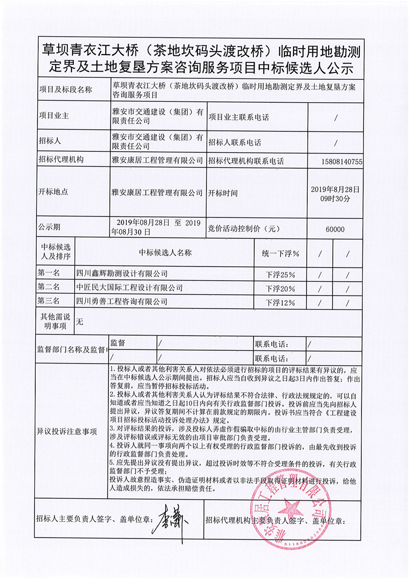 雅安市交通建設(shè)(集團)有限責任公司草壩青衣江大橋(茶地坎碼頭渡改橋)臨時用地勘測定界及土地復墾方案咨詢服務項目競價結(jié)果公示