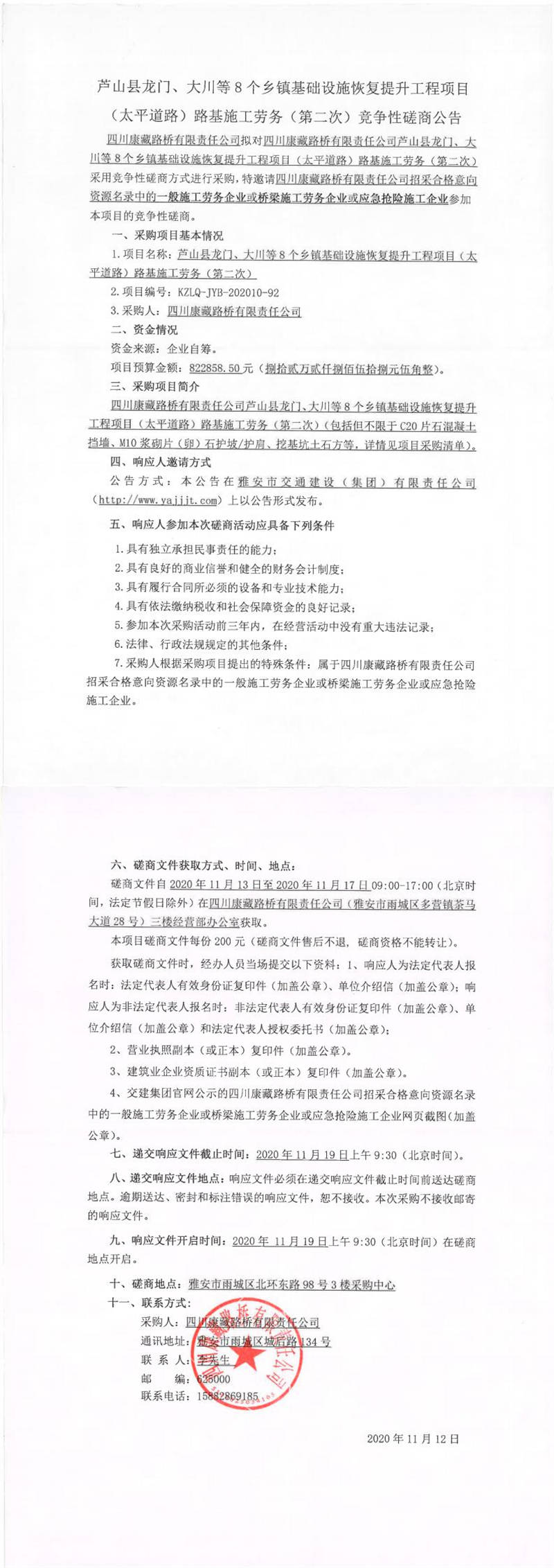 四川康藏路橋有限責(zé)任公司蘆山縣龍門、大川等8個鄉(xiāng)鎮(zhèn)基礎(chǔ)設(shè)施恢復(fù)提升工程項目(太平道路)路基施工勞務(wù)(第二次)競爭性磋商公告