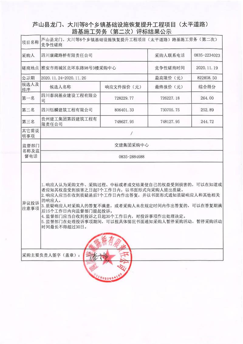 四川康藏路橋有限責任公司蘆山縣龍門、大川等8個鄉(xiāng)鎮(zhèn)基礎設施恢復提升工程項目(太平道路)路基施工勞務(第二次)評標結果公示