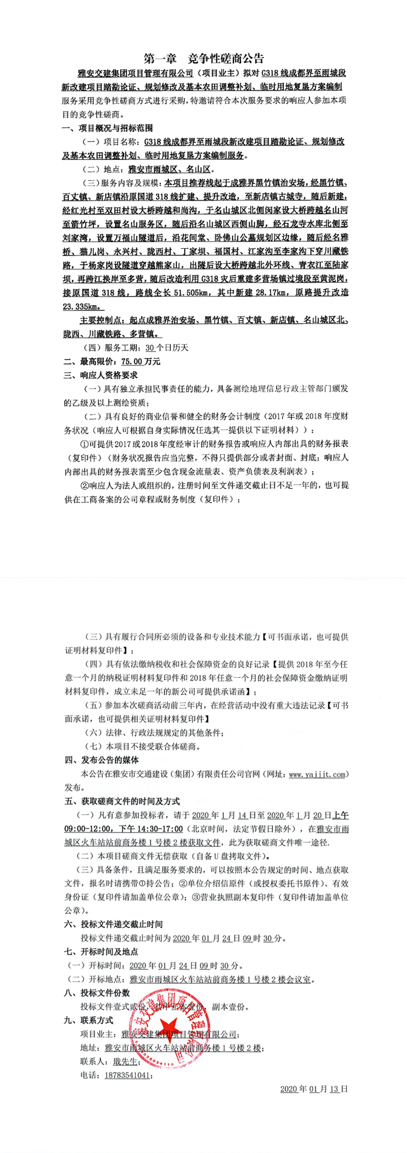 雅安交建集團(tuán)項(xiàng)目管理有限公司G318線成都界至雨城段新改建項(xiàng)目踏勘論證、規(guī)劃修改及基本農(nóng)田調(diào)整補(bǔ)劃、臨地用地復(fù)墾方案編制服務(wù)競爭性磋商公告