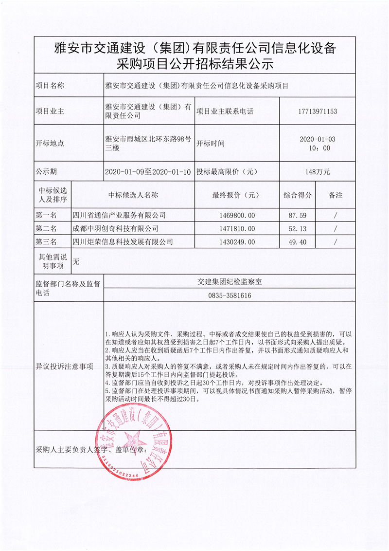 雅安市交通建設(shè)(集團)有限責(zé)任公司信息化設(shè)備采購項目公開招標結(jié)果公示