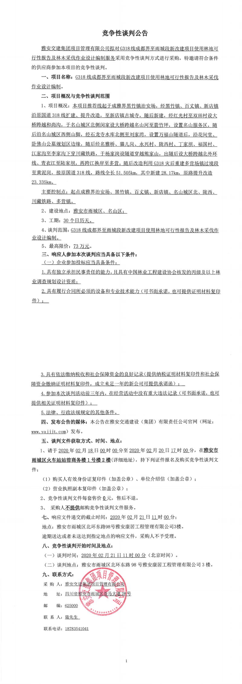 雅安交建集團(tuán)項(xiàng)目管理有限公司G318線(xiàn)成都界至雨城段新改建項(xiàng)目地質(zhì)災(zāi)害危險(xiǎn)性評(píng)價(jià)編制競(jìng)爭(zhēng)性談判公告
