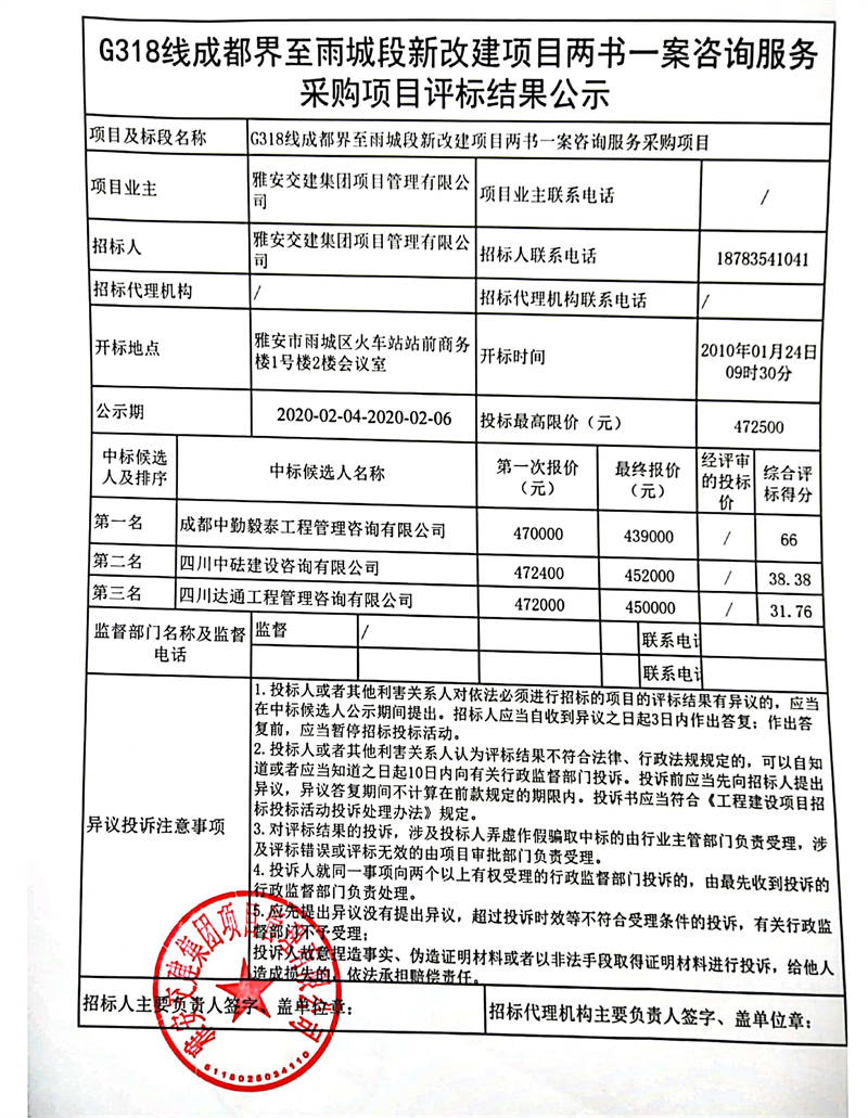 雅安交建集團項目管理有限公司G318線成都界至雨城段新改建項目踏勘論證、規(guī)劃修改及基本農(nóng)田調(diào)整補劃、臨時用地復(fù)墾方案編制服務(wù)采購項目評標(biāo)結(jié)果公示