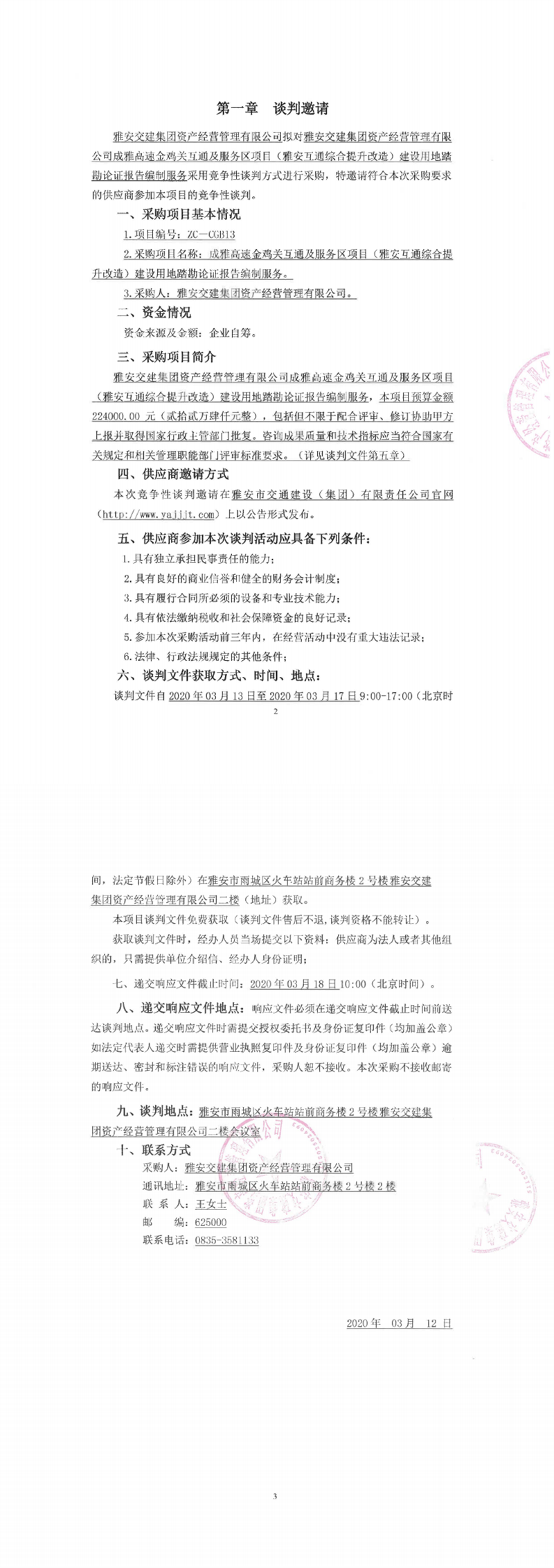 雅安交建集團(tuán)資產(chǎn)經(jīng)營(yíng)管理有限公司成雅高速金雞關(guān)互通及服務(wù)區(qū)項(xiàng)目(雅安互通綜合提升改造)建設(shè)用地踏勘論證報(bào)告編制服務(wù)競(jìng)爭(zhēng)性談判公告