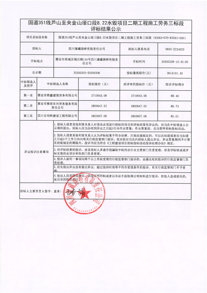四川康藏路橋有限責(zé)任公司國道351線蘆山至夾金山埡口段8.22水毀項(xiàng)目二期工程施工勞務(wù)三標(biāo)段評標(biāo)結(jié)果公示