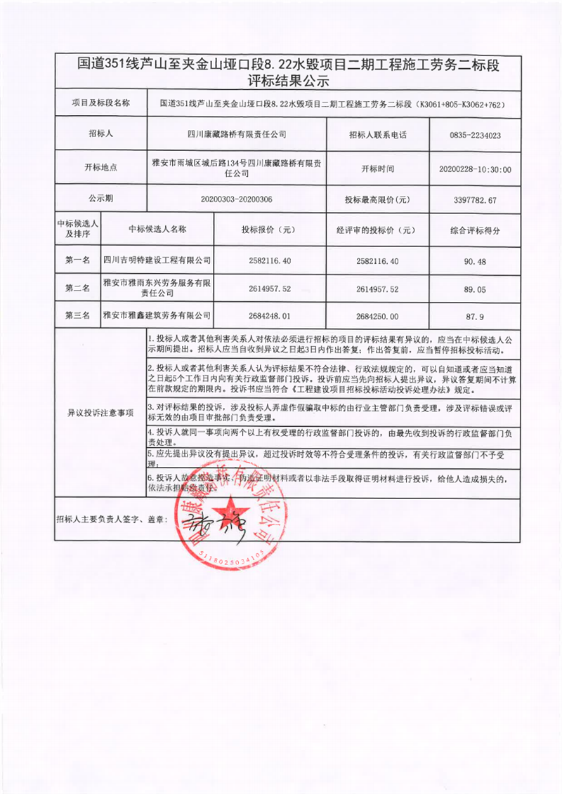 四川康藏路橋有限責任公司國道351線蘆山至夾金山埡口段8.22水毀項目二期工程施工勞務(wù)二標段評標結(jié)果公示