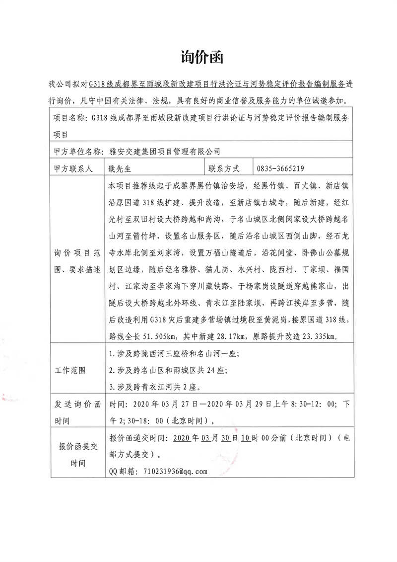 雅安交建集團(tuán)項(xiàng)目管理有限公司G318線成都界至雨城段新改建項(xiàng)目行洪論證與河勢穩(wěn)定評價(jià)報(bào)告編制服務(wù)項(xiàng)目詢價(jià)函