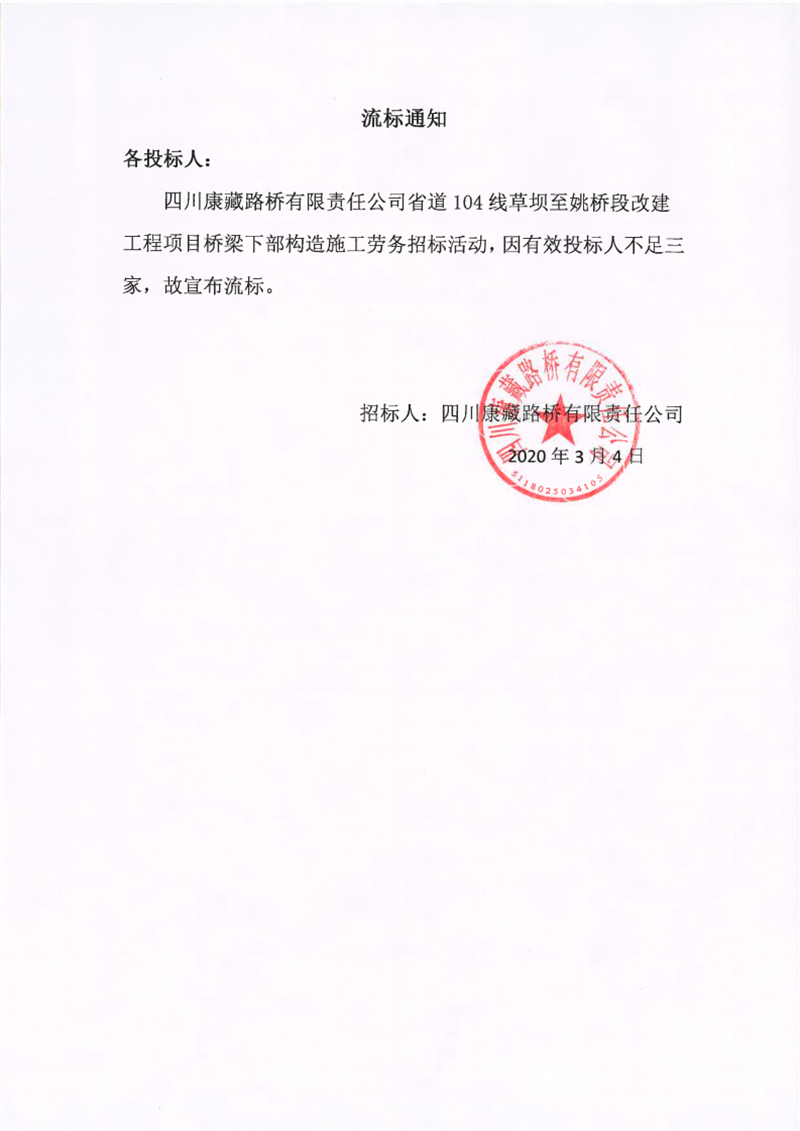 四川康藏路橋有限責任公司省道104線草壩至姚橋段改建工程項目橋梁下部構(gòu)造施工勞務(wù)流標通知
