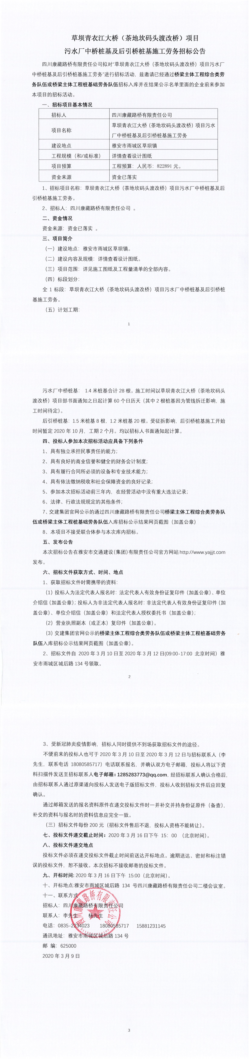 四川康藏路橋有限責(zé)任公司草壩青衣江大橋(茶地坎碼頭渡改橋)項目污水廠中橋樁基及后引橋樁基施工勞務(wù)招標(biāo)公告