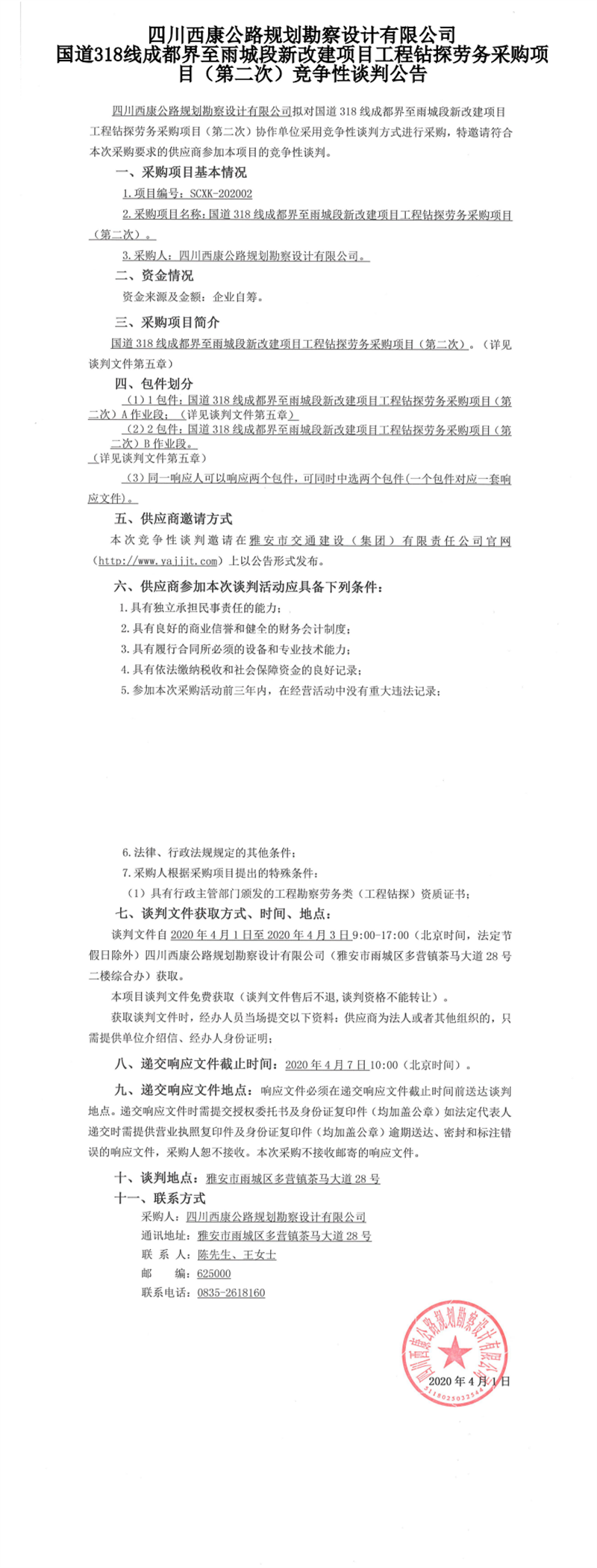 四川西康公路規(guī)劃勘察設(shè)計(jì)有限公司國道318線成都界至雨城段新改建項(xiàng)目工程鉆探勞務(wù)采購項(xiàng)目(第二次)競爭性談判公告