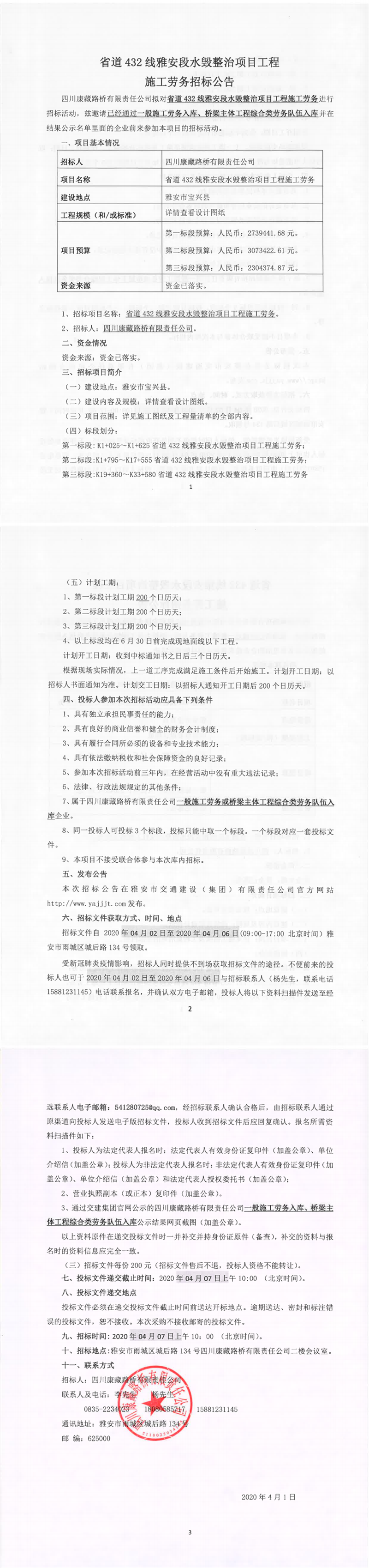 四川康藏路橋有限責(zé)任公司省道432線雅安段水毀整治項目工程施工勞務(wù)招標公告