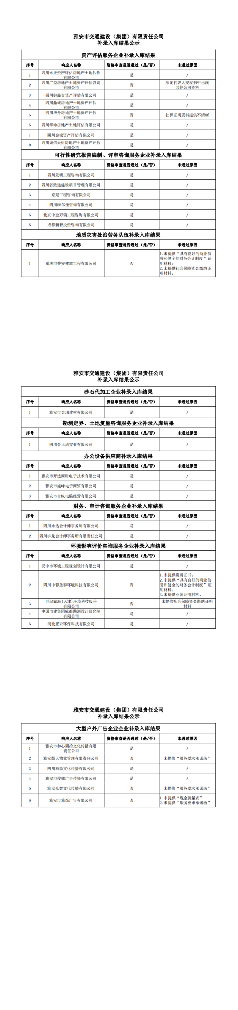 雅安市交通建設(shè)(集團(tuán))有限責(zé)任公司補(bǔ)錄入庫結(jié)果公示