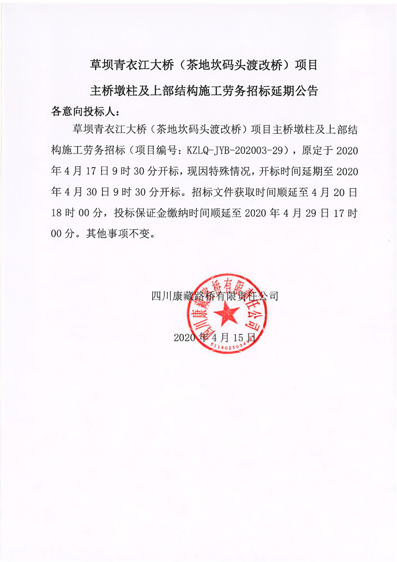 四川康藏路橋有限責任公司草壩青衣江大橋(茶地坎碼頭渡改橋)項目主橋墩柱及上部結構施工勞務招標延期公告