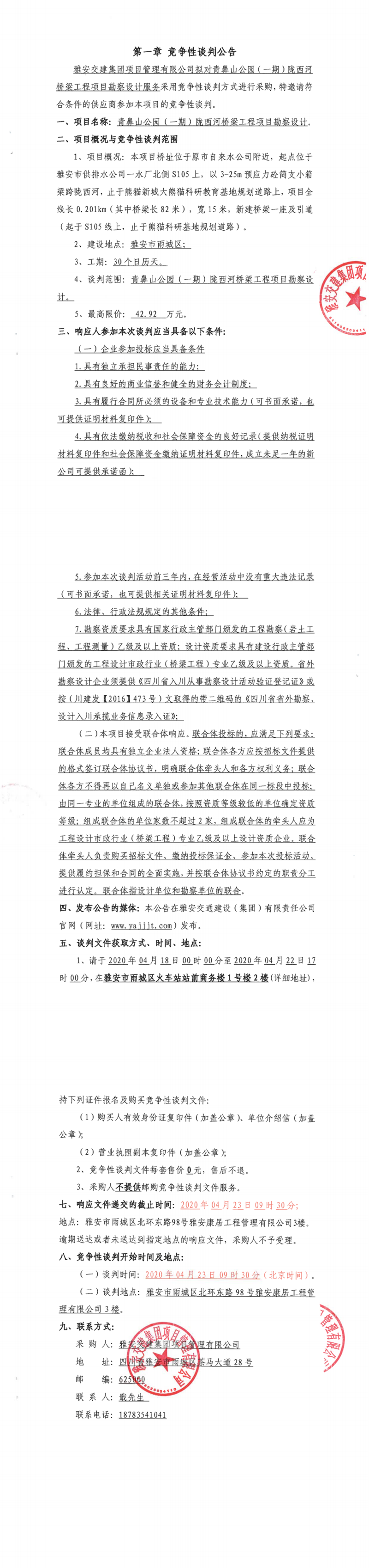 雅安交建集團項目管理有限公司青鼻山公園(一期)隴西河橋梁工程項目勘察設計競爭性談判公告