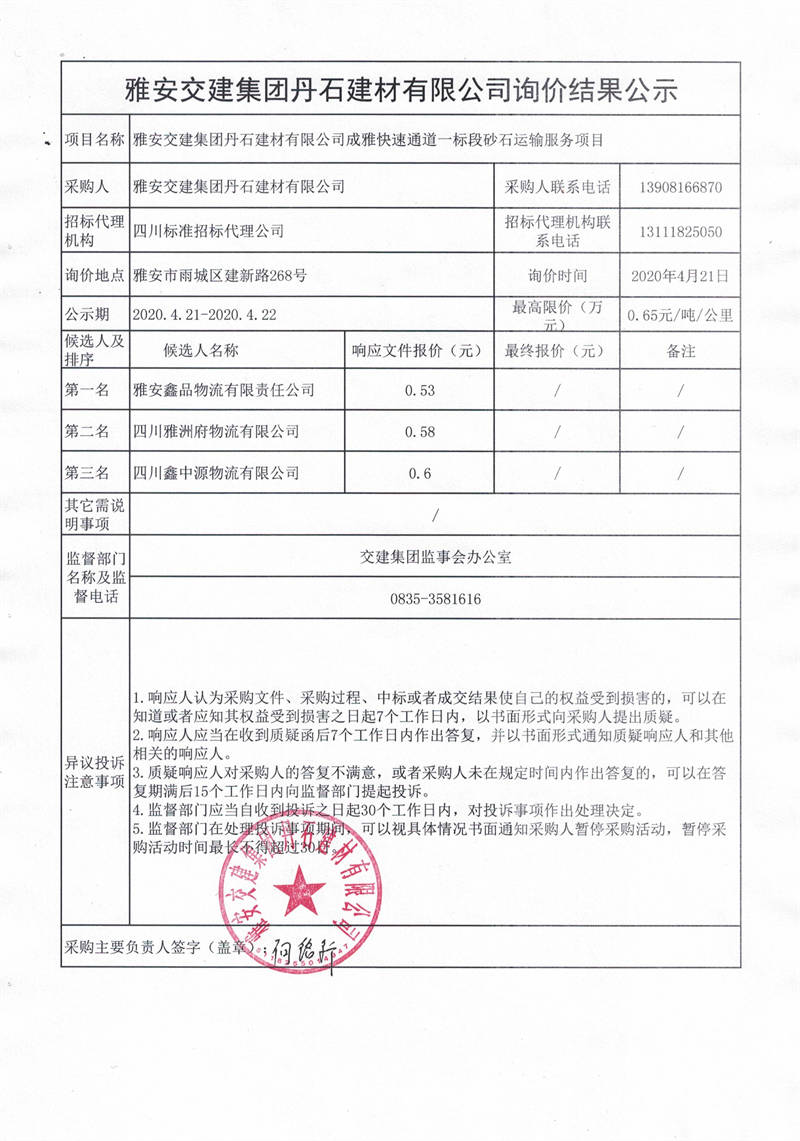 雅安交建集團丹石建材有限公司成雅快速通道一標(biāo)段砂石運輸服務(wù)項目詢價結(jié)果公示