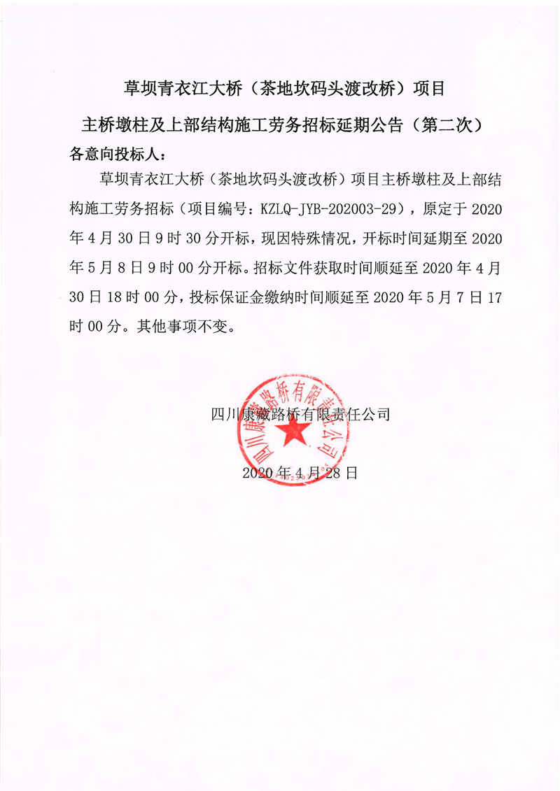 四川康藏路橋有限責(zé)任公司草壩青衣江大橋(茶地坎碼頭渡改橋)項目主橋墩柱及上部結(jié)構(gòu)施工勞務(wù)招標(biāo)延期公告(第二次)