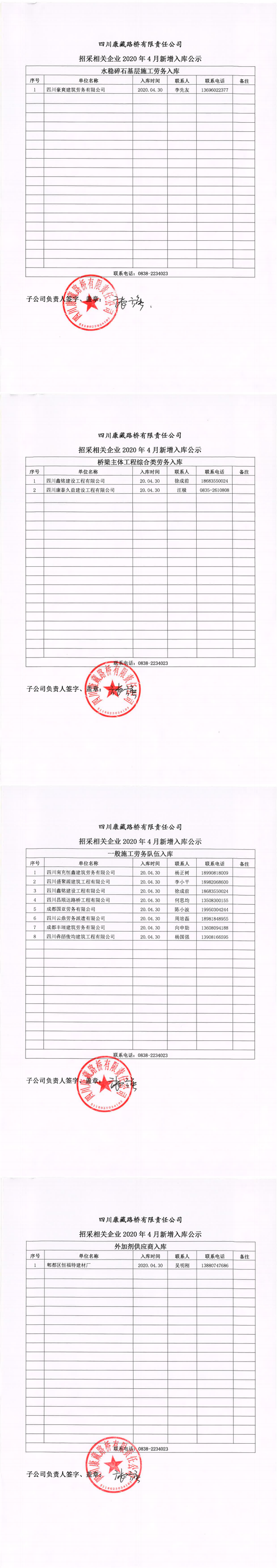 四川康藏路橋有限責(zé)任公司招采相關(guān)企業(yè)2020年4月新增入庫(kù)公示