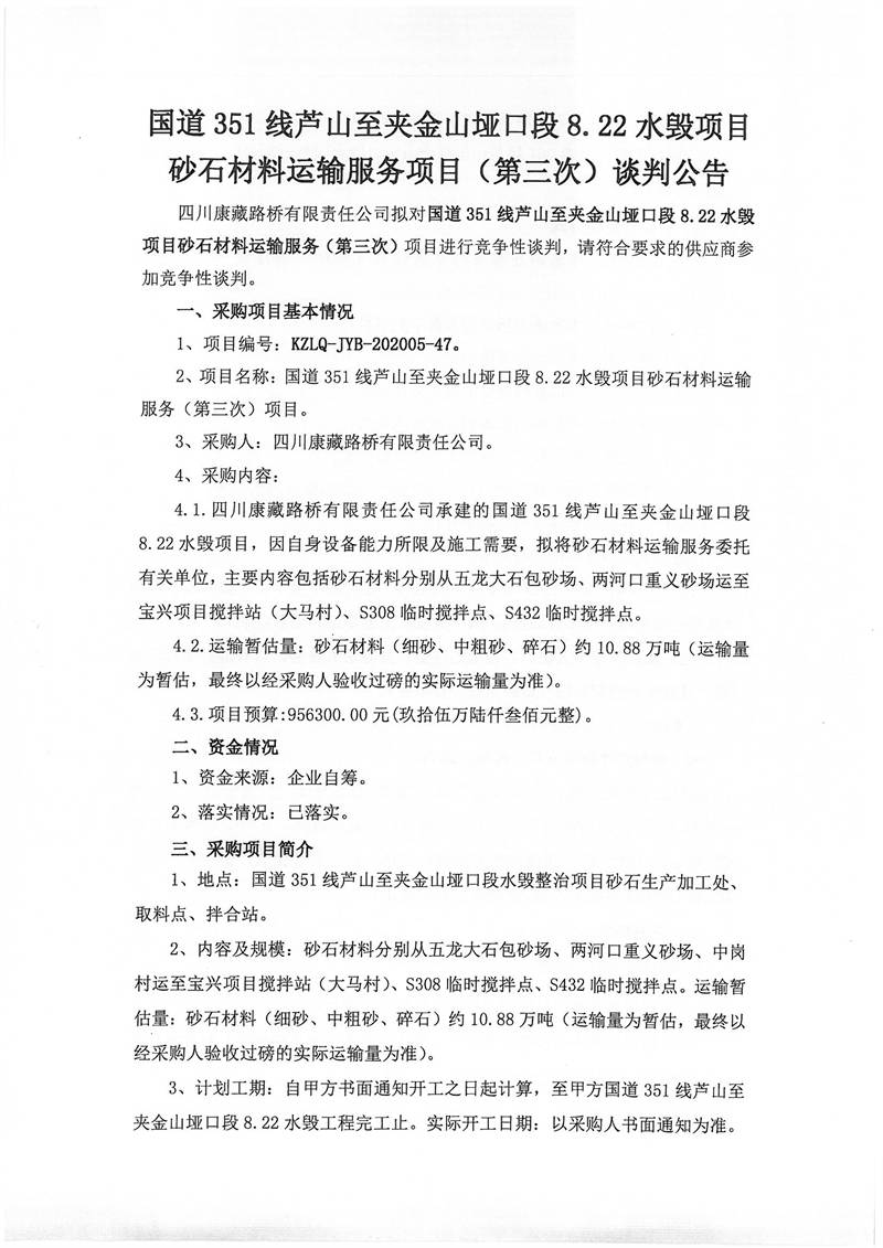 四川康藏路橋有限責(zé)任公司國道351線蘆山至夾金山埡口段8.22水毀項目砂石材料運(yùn)輸服務(wù)項目(第三次)談判公告