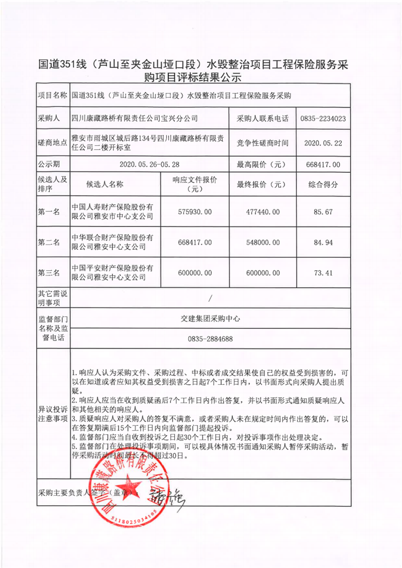 四川康藏路橋有限責(zé)任公司寶興分公司國道351線(蘆山至夾金山埡口段)水毀整治項(xiàng)目工程保險服務(wù)采購項(xiàng)目評標(biāo)結(jié)果公示