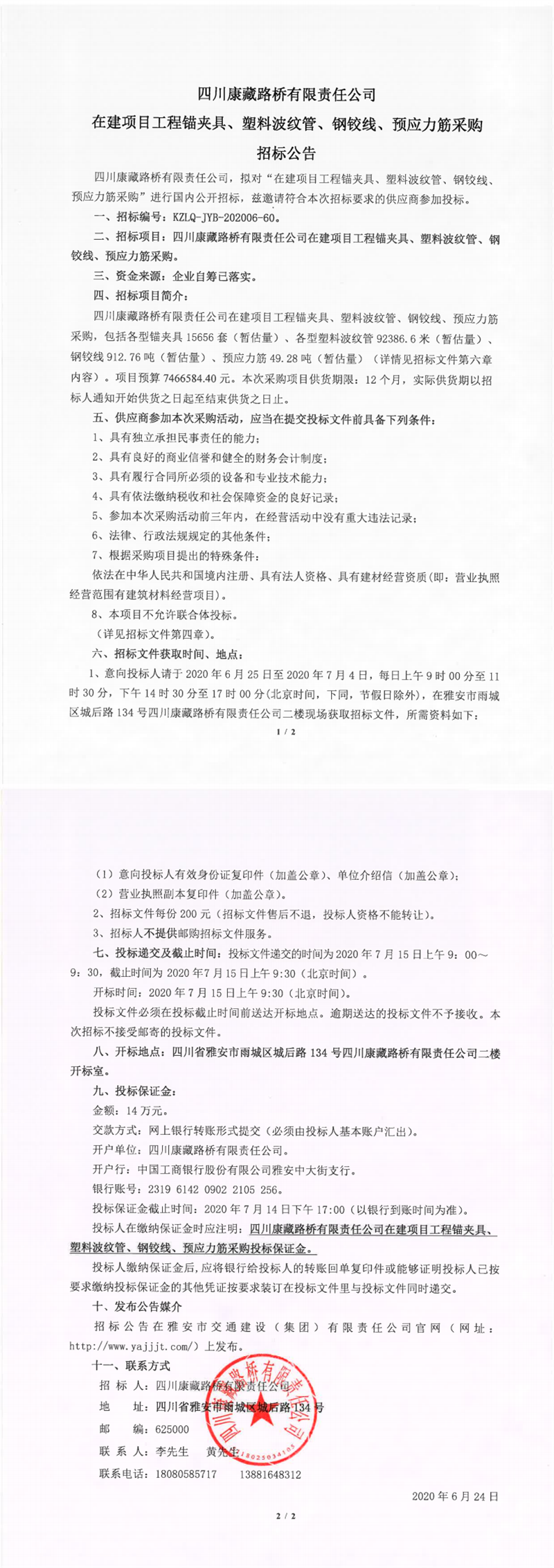 四川康藏路橋有限責(zé)任公司在建項(xiàng)目工程錨夾具、塑料波紋管、鋼鉸線、預(yù)應(yīng)力筋采購招標(biāo)公告