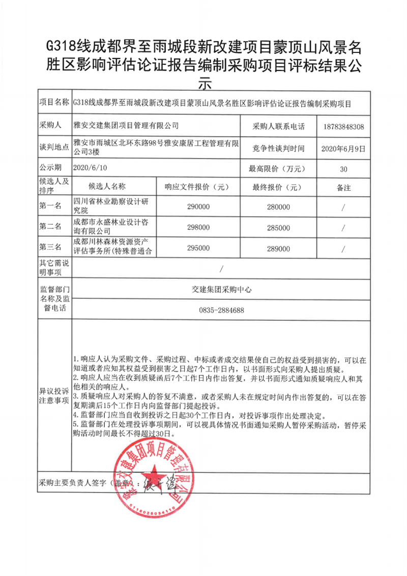 雅安交建集團項目管理有限公司G318線成都界至雨城段新改建項目蒙頂山風(fēng)景名勝區(qū)影響評估論證報告編制采購項目評標(biāo)結(jié)果公示