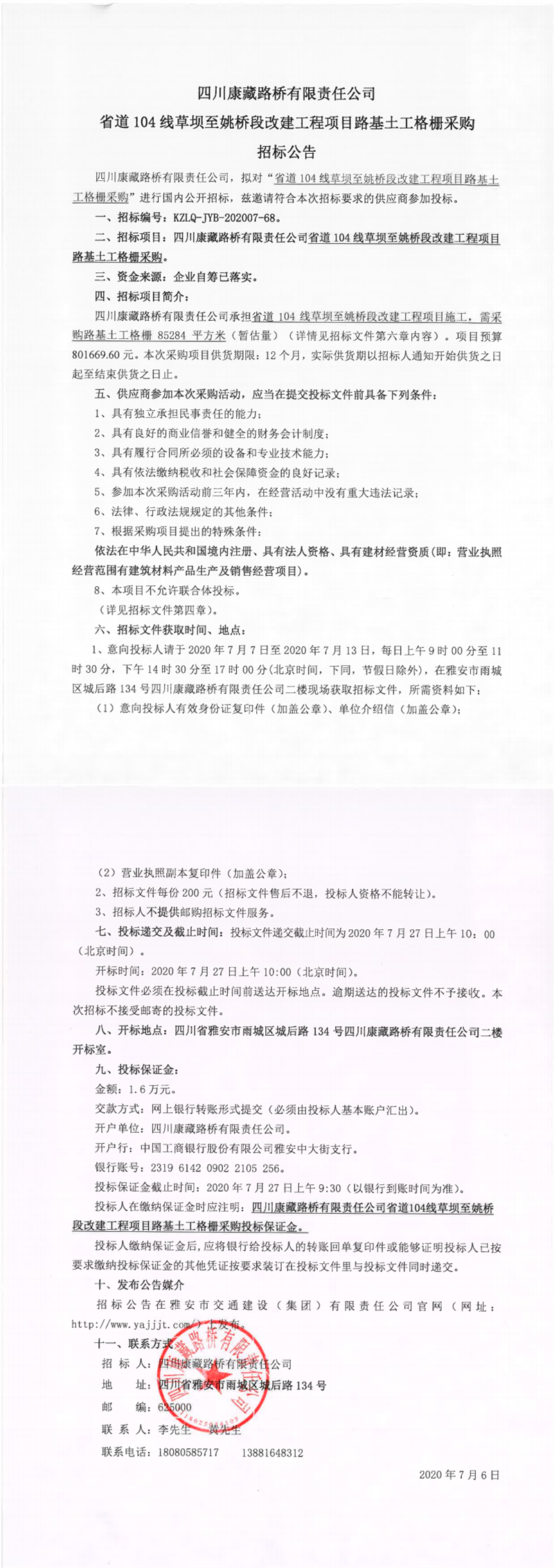 四川康藏路橋有限責(zé)任公司省道104線草壩至姚橋段改建工程項(xiàng)目路基土工格柵采購招標(biāo)公告