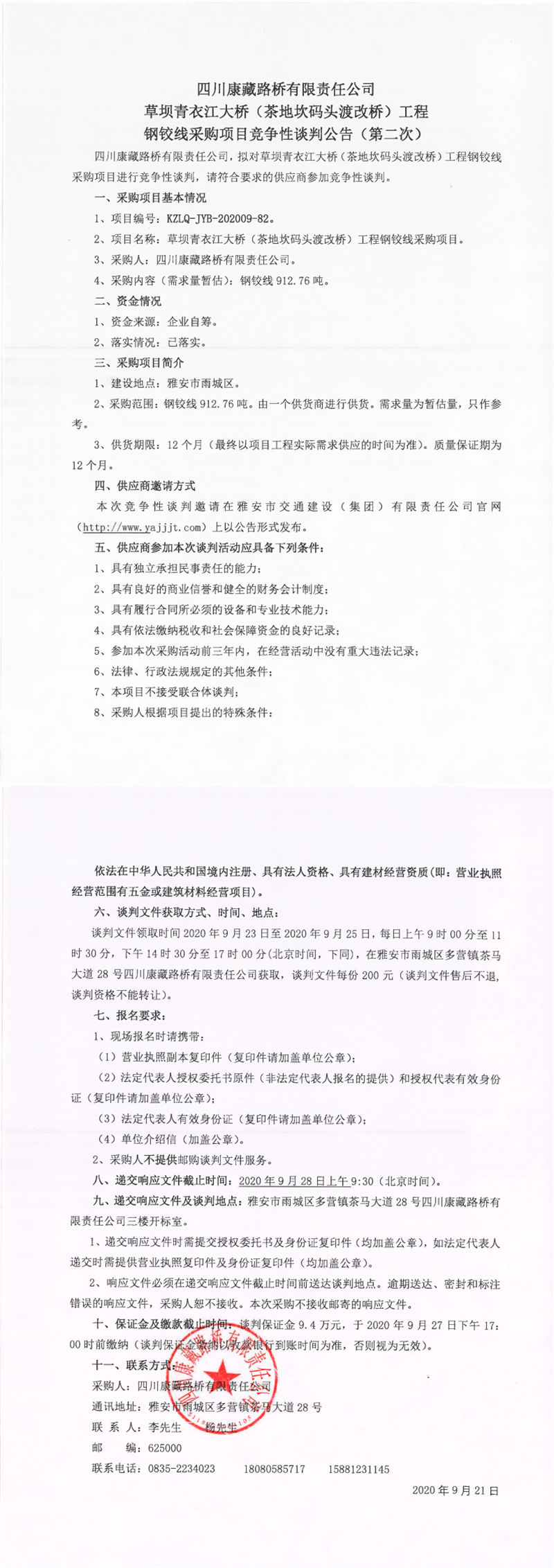 四川康藏路橋有限公司草壩青衣江大橋(茶地坎碼頭渡改橋)工程鋼鉸線(xiàn)采購(gòu)項(xiàng)目競(jìng)爭(zhēng)性談判公告(第二次)