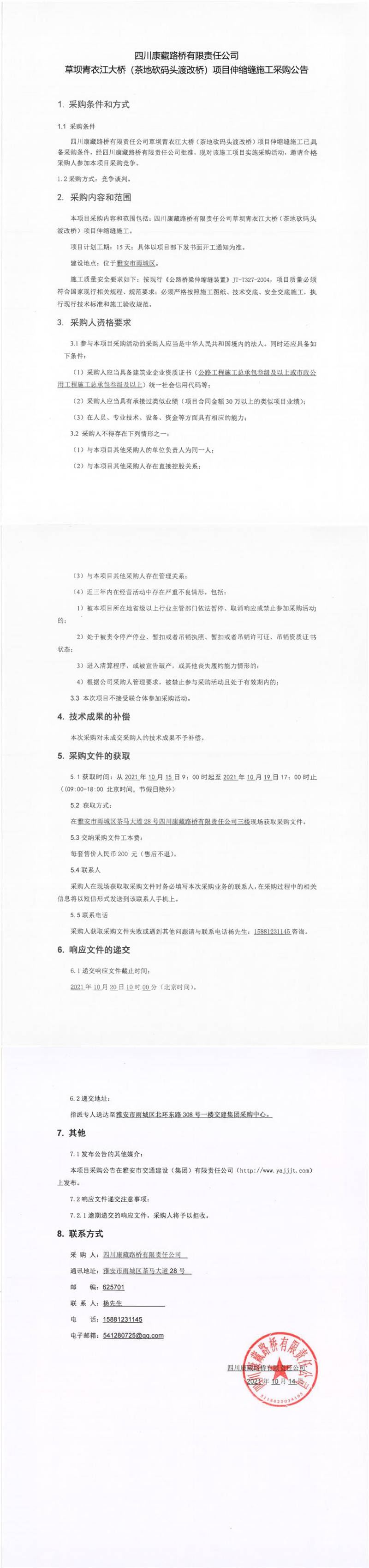 四川康藏路橋有限責(zé)任公司草壩青衣江大橋(茶地坎碼頭渡改橋)項(xiàng)目伸縮縫施工采購(gòu)公告