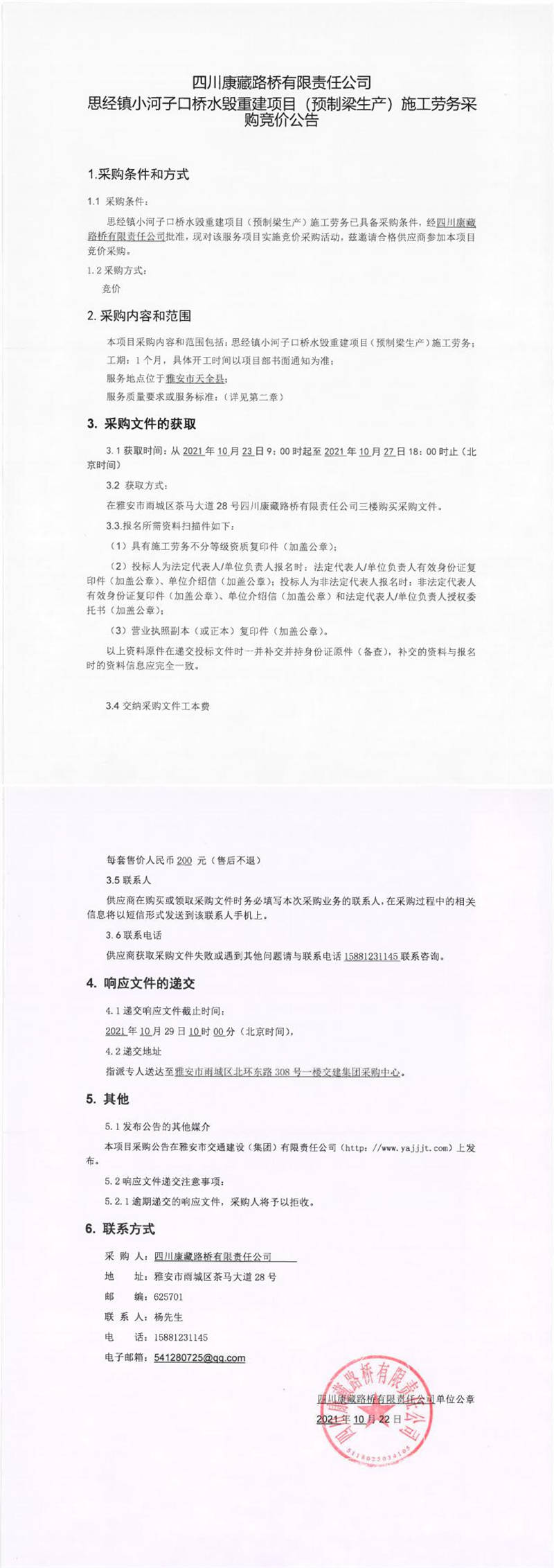 四川康藏路橋有限責(zé)任公司思經(jīng)鎮(zhèn)小河子口橋水毀重建項目(預(yù)制梁生產(chǎn))施工勞務(wù)采購競價公告