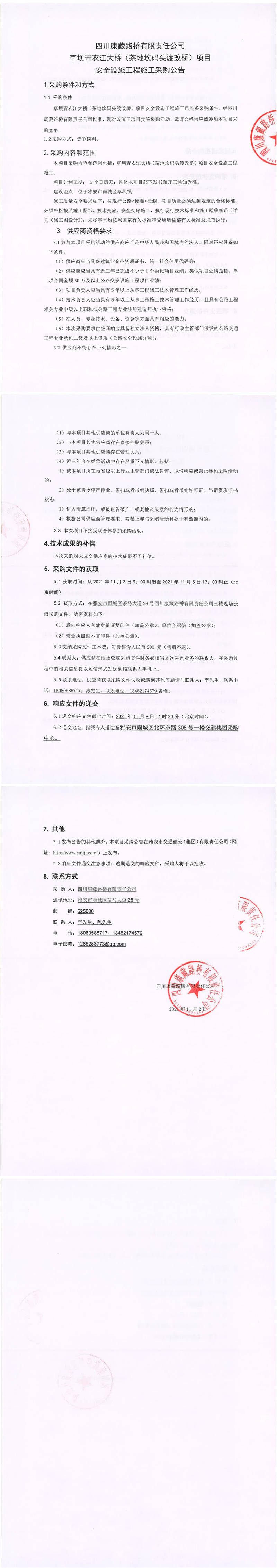 四川康藏路橋有限責任公司草壩青衣江大橋(茶地坎碼頭渡改橋)項目安全設施工程施工采購公告