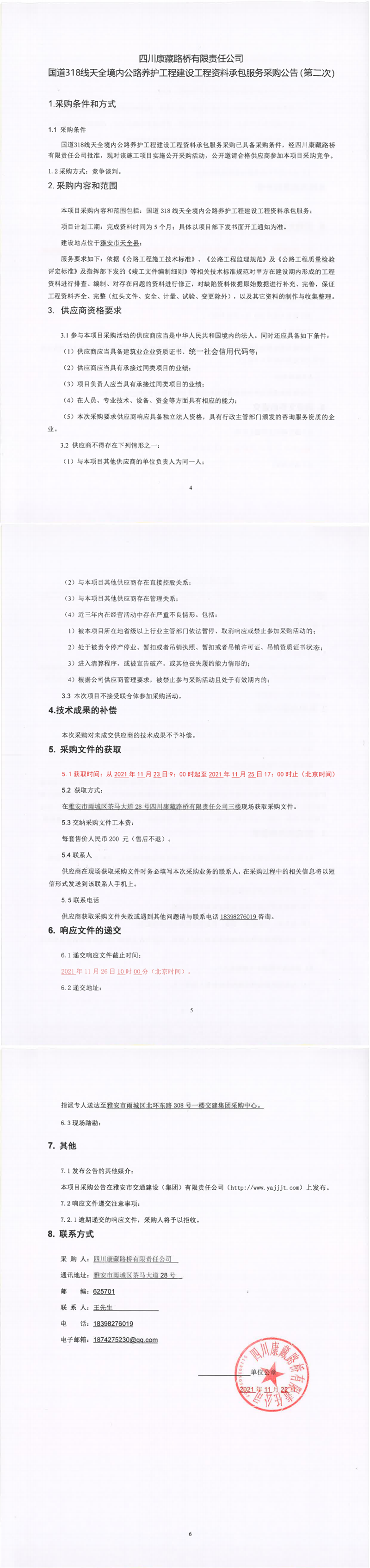 四川康藏路橋有限責(zé)任公司國(guó)道318線天全境內(nèi)公路養(yǎng)護(hù)工程建設(shè)工程資料承包服務(wù)采購(gòu)公告(第二次)