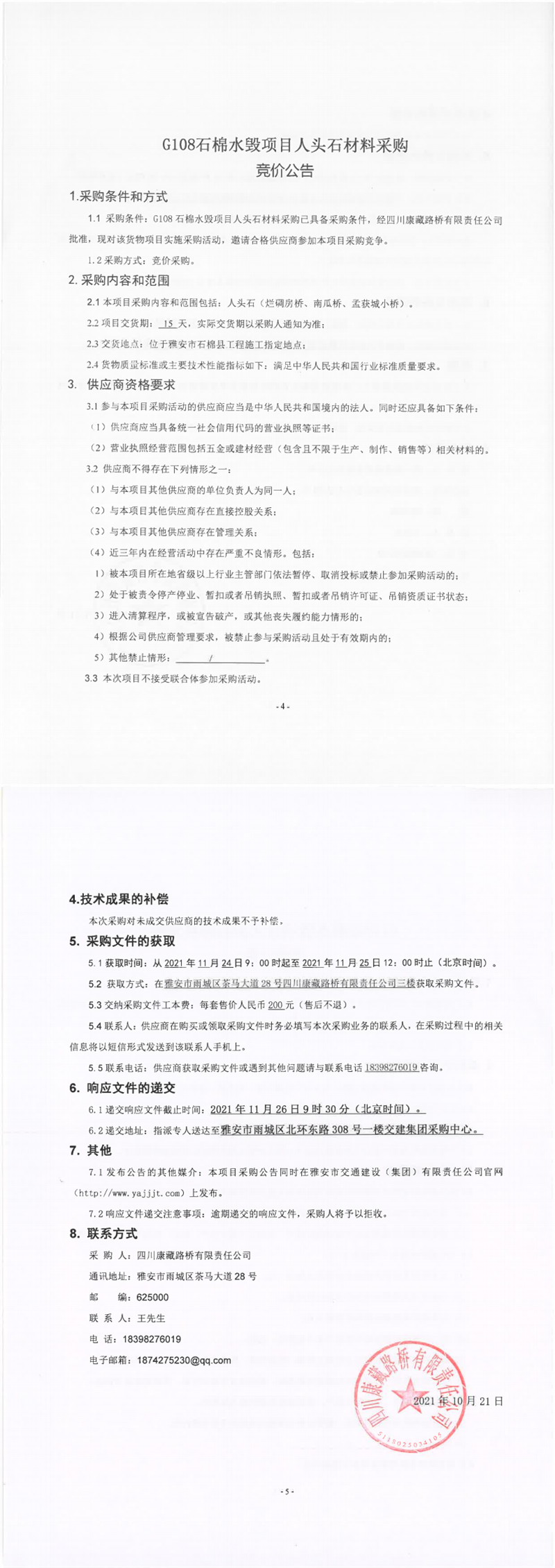 四川康藏路橋有限責(zé)任公司G108石棉水毀項目人頭石材料采購競價公告