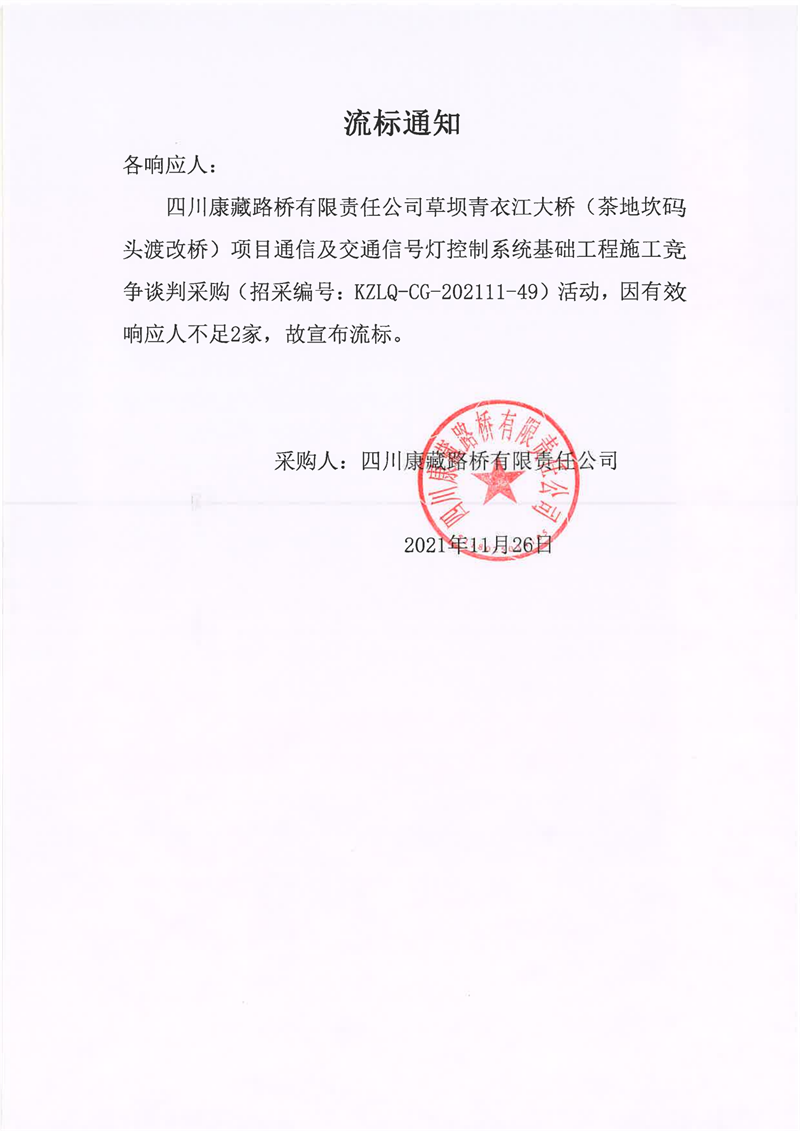 四川康藏路橋有限責(zé)任公司草壩青衣江大橋(茶地坎碼頭渡改橋)項(xiàng)目通信及交通信號(hào)燈控制系統(tǒng)基礎(chǔ)工程施工采購(gòu)流標(biāo)通知