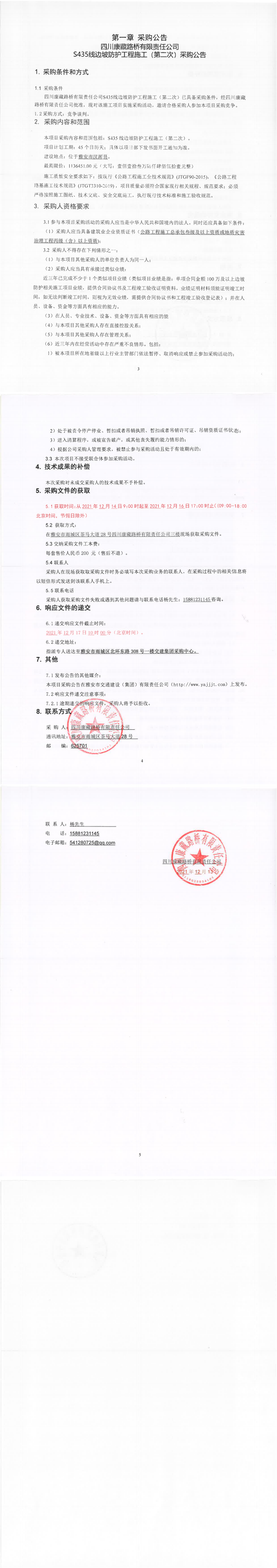 四川康藏路橋有限責(zé)任公司S435線邊坡防護(hù)工程施工(第二次)采購公告