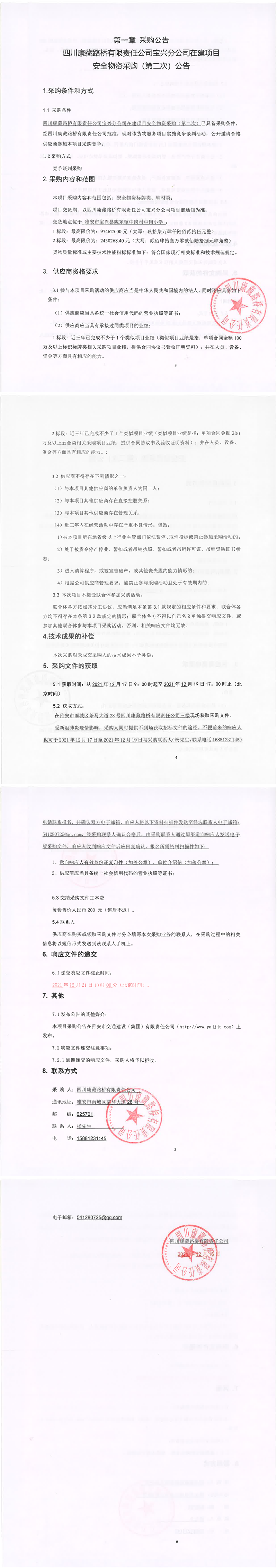 四川康藏路橋有限責(zé)任公司寶興分公司在建項(xiàng)目安全物資采購(第二次)公告