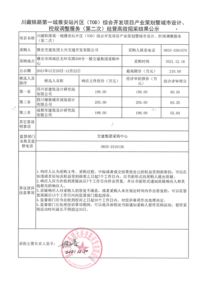 雅安交建集團(tuán)大興交通開發(fā)有限公司川藏鐵路第一城雅安站片區(qū)(TOD)綜合開發(fā)項(xiàng)目產(chǎn)業(yè)策劃暨城市設(shè)計(jì)、控規(guī)調(diào)整服務(wù)(第二次)經(jīng)營高效招采結(jié)果公示