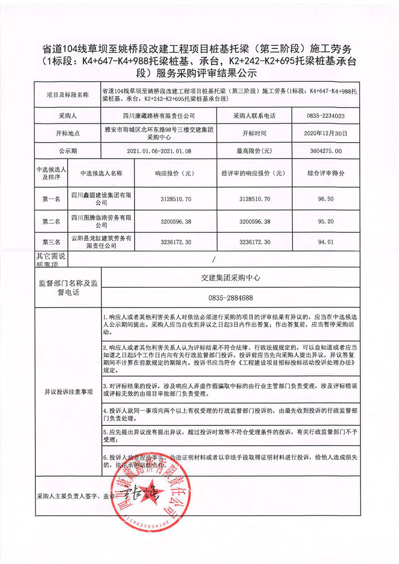 四川康藏路橋有限責(zé)任公司省道104線草壩至姚橋段改建工程項(xiàng)目樁基托梁(第三階段)施工勞務(wù)服務(wù)1標(biāo)段采購評(píng)審結(jié)果公示