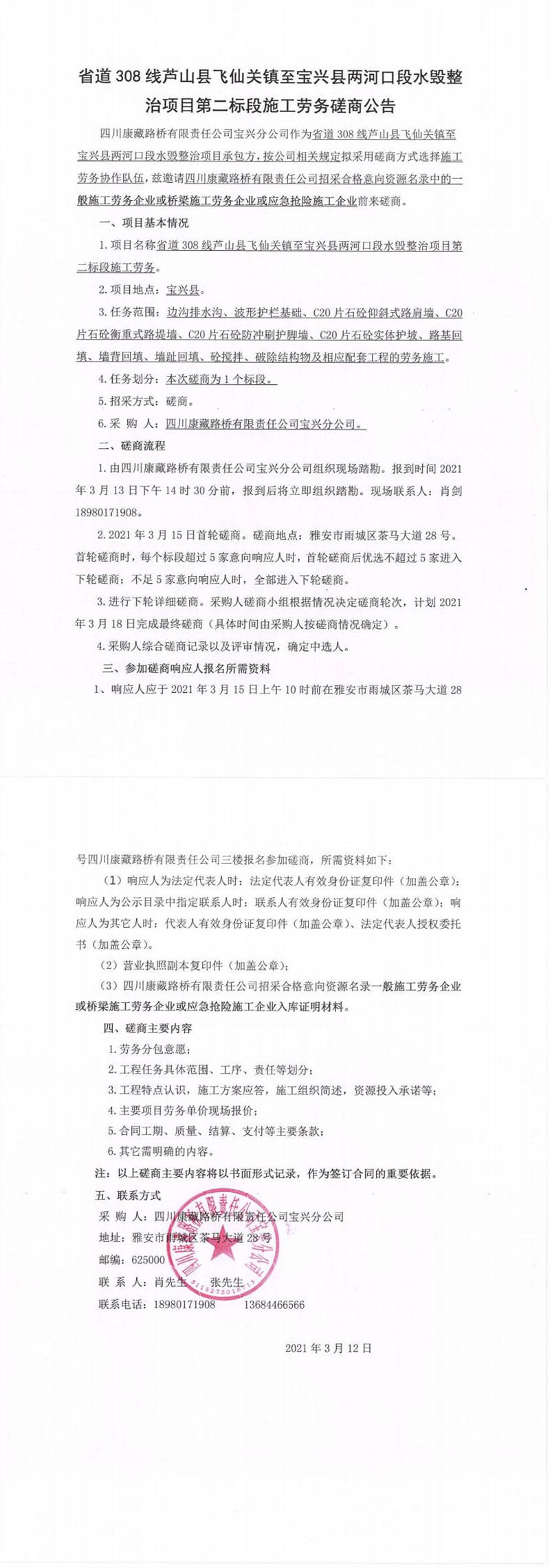 四川康藏路橋有限責任公司寶興分公司省道308線蘆山縣飛仙關(guān)鎮(zhèn)至寶興縣兩河口段水毀整治項目第二標段施工勞務(wù)磋商公告