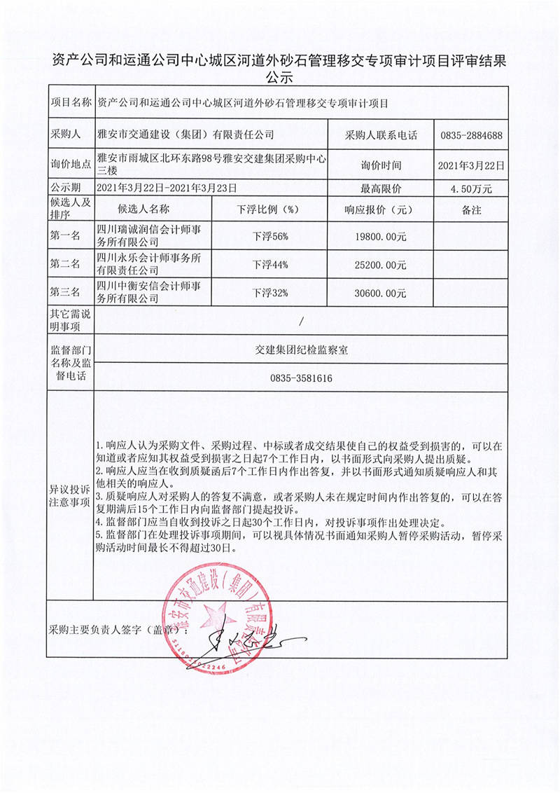 雅安市交通建設(shè)(集團(tuán))有限責(zé)任公司資產(chǎn)公司和運(yùn)通公司中心城區(qū)河道外砂石管理移交專(zhuān)項(xiàng)審計(jì)項(xiàng)目評(píng)審結(jié)果公示