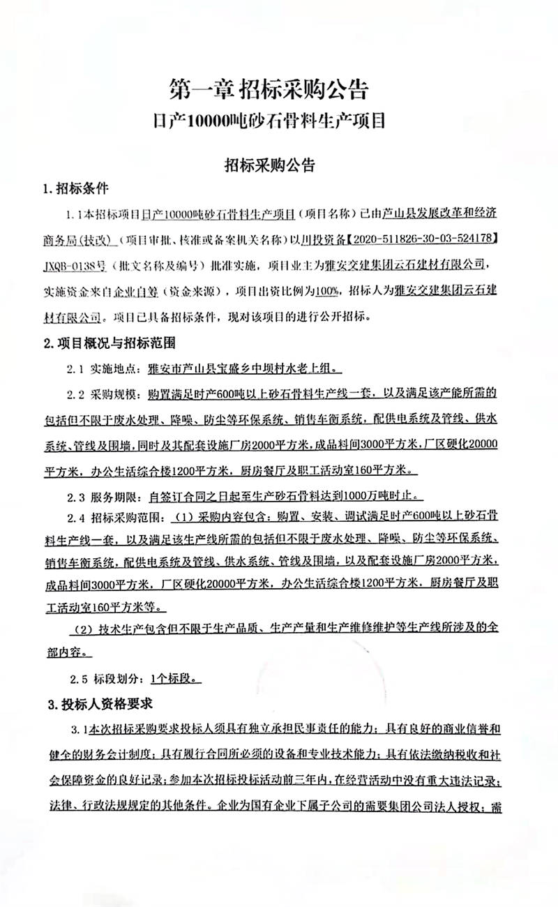 雅安交建集團(tuán)云石建材有限公司日產(chǎn)10000噸砂石骨料生產(chǎn)項(xiàng)目招標(biāo)采購公告