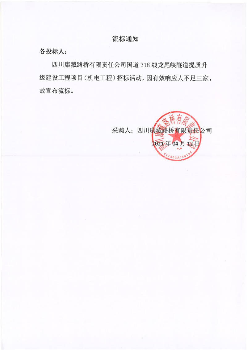 四川康藏路橋有限責(zé)任公司國道318線龍尾峽隧道提質(zhì)升級建設(shè)工程項目(機(jī)電工程)流標(biāo)通知