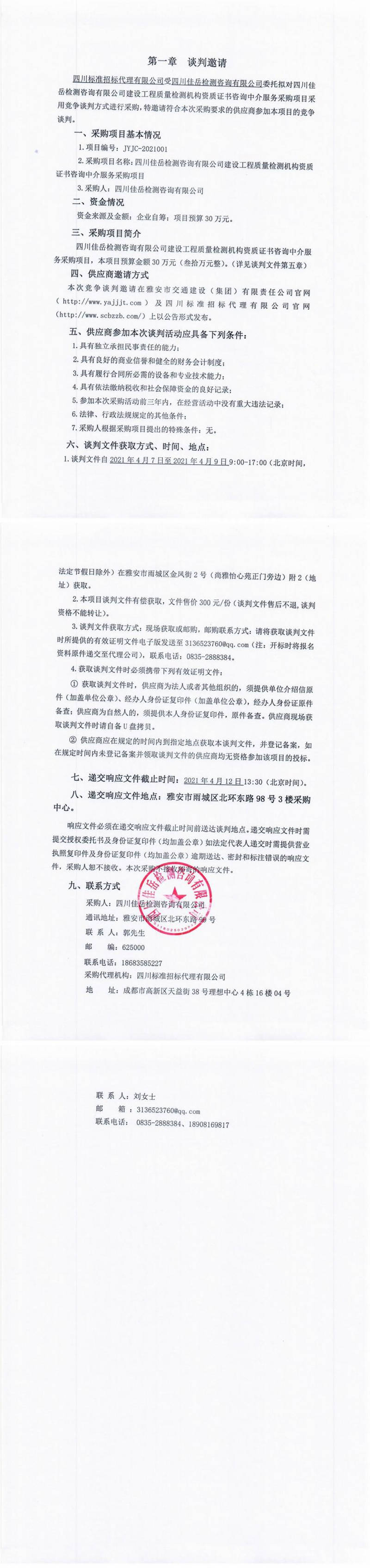 四川佳岳檢測咨詢有限公司建設(shè)工程質(zhì)量檢測機(jī)構(gòu)資質(zhì)證書咨詢中介服務(wù)采購項(xiàng)目競爭談判公告
