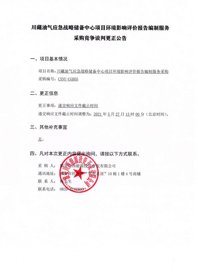 雅安川西能源投資開發(fā)有限公司川藏油氣應(yīng)急戰(zhàn)略儲(chǔ)備中心項(xiàng)目環(huán)境影響評(píng)價(jià)報(bào)告編制服務(wù)采購競爭談判更正公告
