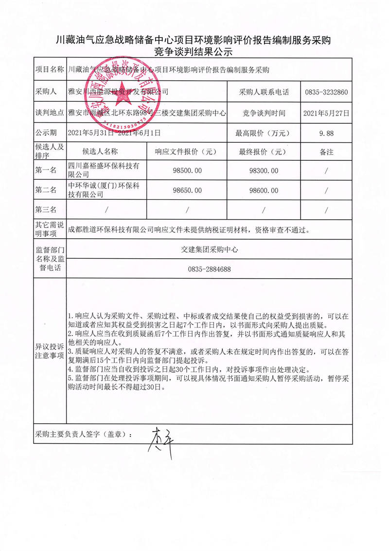雅安川西能源投資開發(fā)有限公司川藏油氣應(yīng)急戰(zhàn)略儲備中心項目環(huán)境影響評價報告編制服務(wù)采購競爭性談判結(jié)果公示