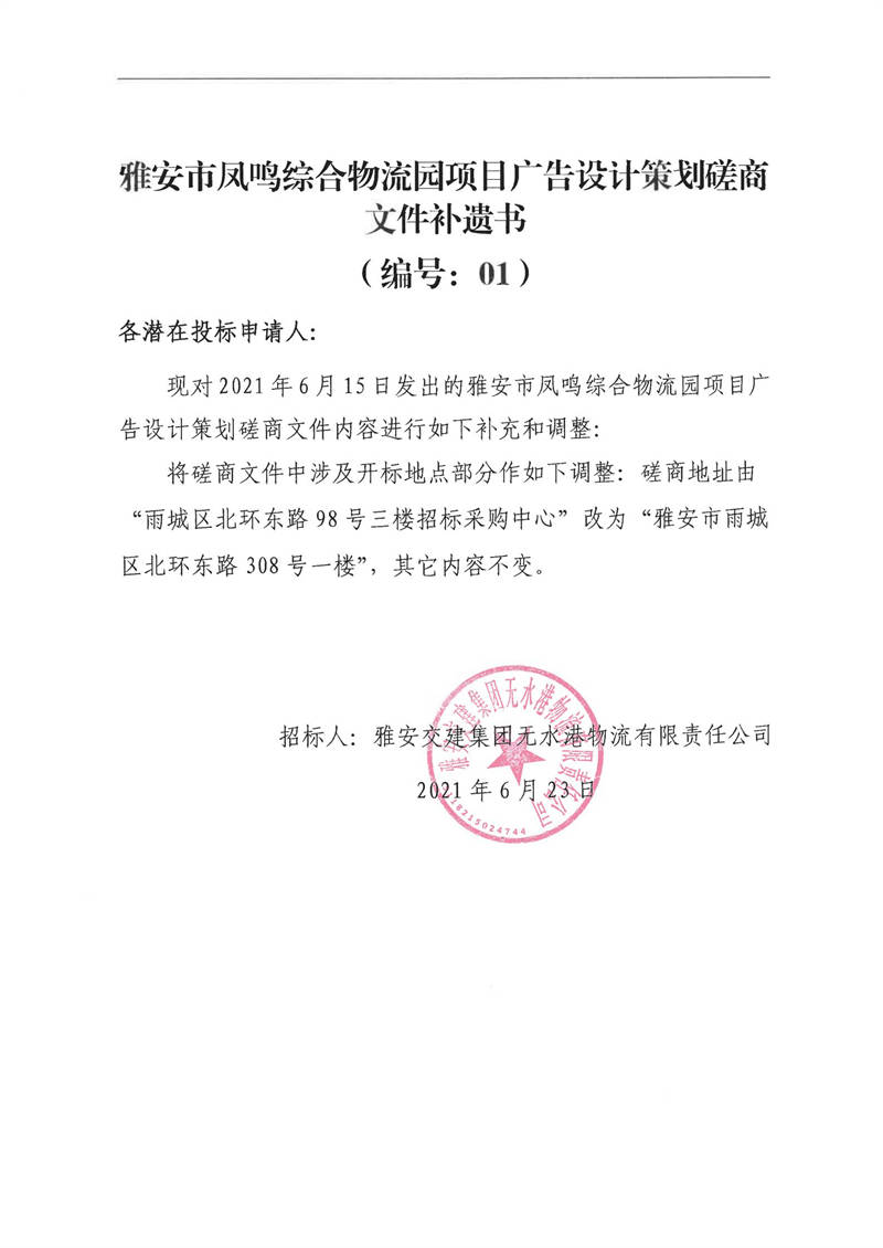 雅安交建集團(tuán)無(wú)水港物流有限責(zé)任公司雅安市鳳鳴綜合物流園項(xiàng)目廣告設(shè)計(jì)策劃磋商文件補(bǔ)遺書