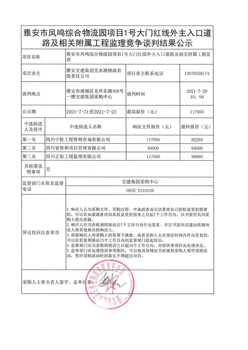 雅安交建集團(tuán)無水港物流有限責(zé)任公司雅安市鳳鳴綜合物流園項目1號大門紅線外主入口道路及相關(guān)附屬工程監(jiān)理競爭談判結(jié)果公示